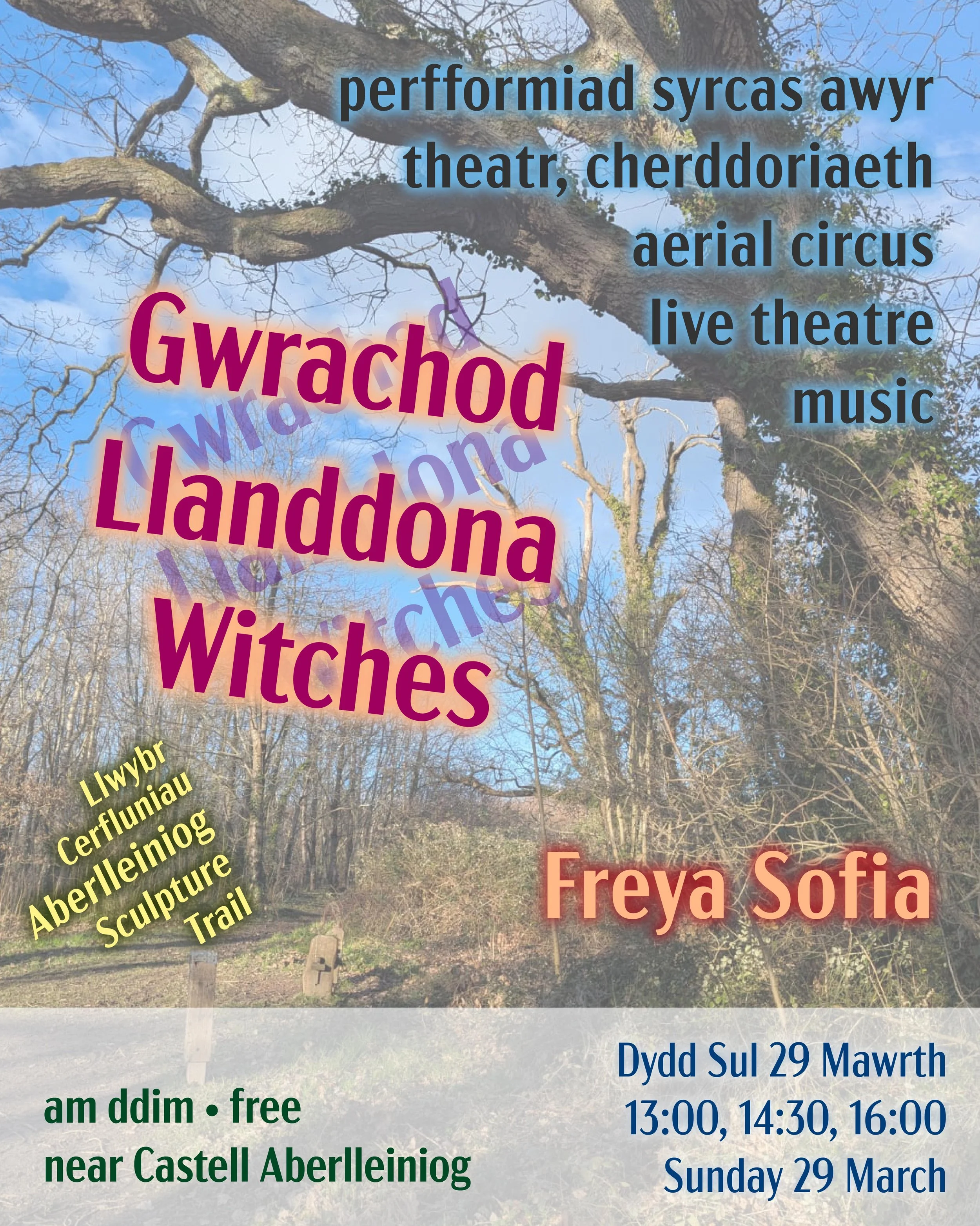 Perfformiad syrcas awyr, theatr a cherddoriaeth fyw gan Freya Sofia . Bydd hi'n cael ei hongian o goeden hynafol ger Castell Aberlleiniog, gan ail-ddychmygu chwedl werin atgofus Gwrachod Llanddona mewn troell o uchder, cysgod a chân.