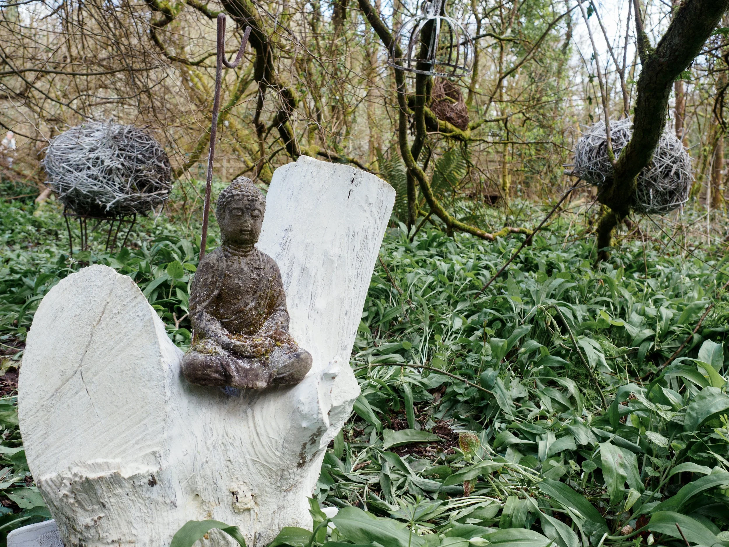 Mae canghennau, brigau a llinyn a gasglwyd o goed a chartrefi yn ffurfio Myfyrdod Coed, gwaith a luniwyd gan arsylwi a dychwelyd yn hytrach na bwriad. Wedi'i ganoli ar un goeden, mae'n dilyn dŵr, golau, gwynt a thwf wrth i amser gasglu'n dawel o'i chwmpas.