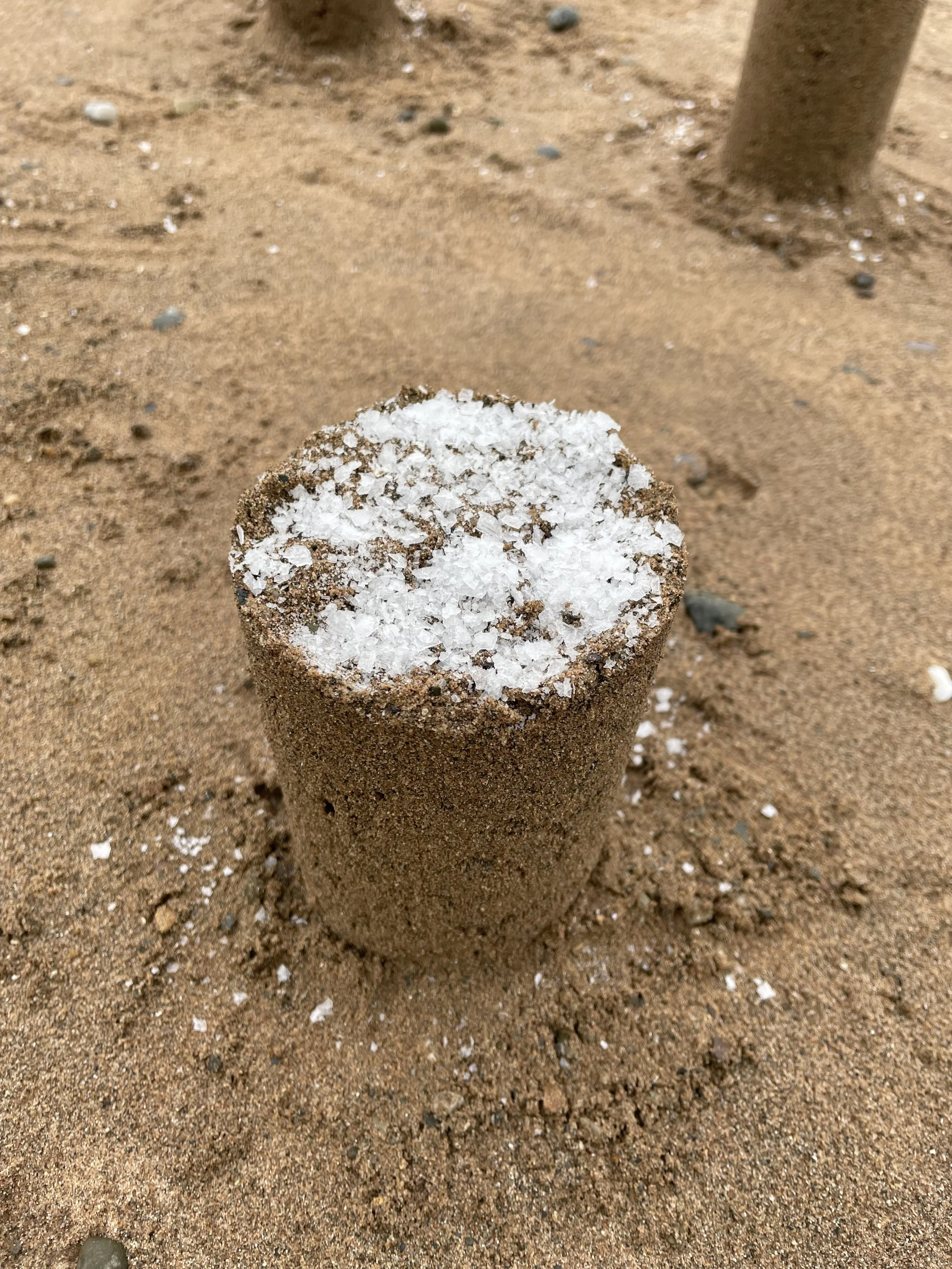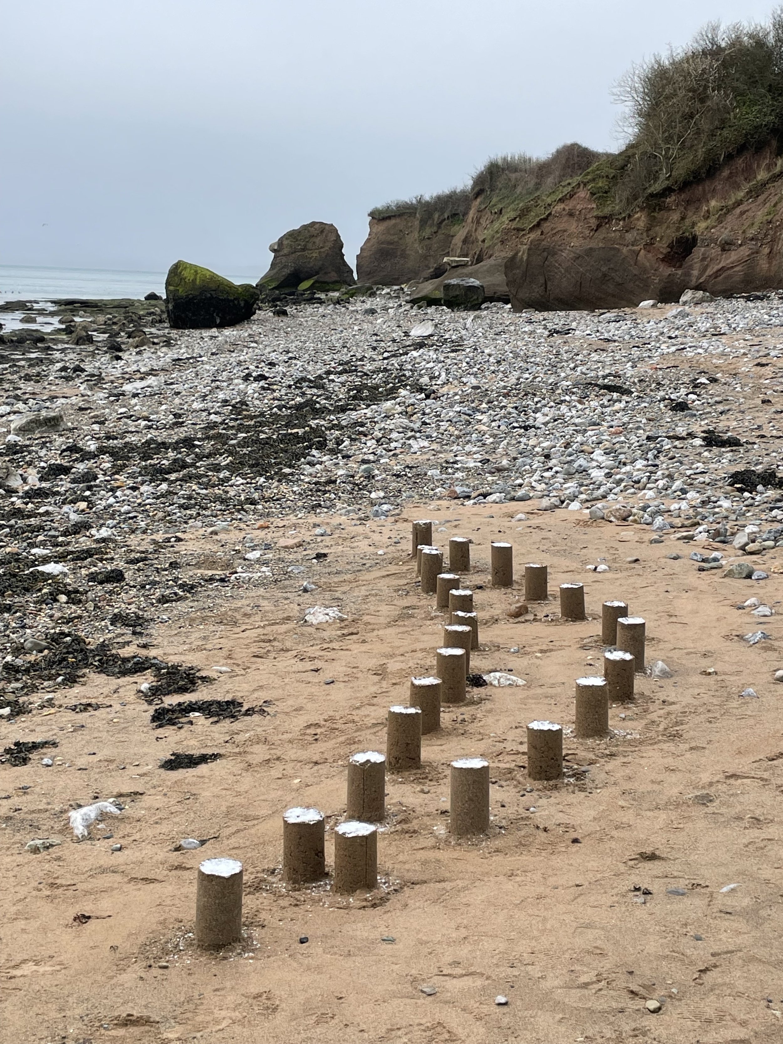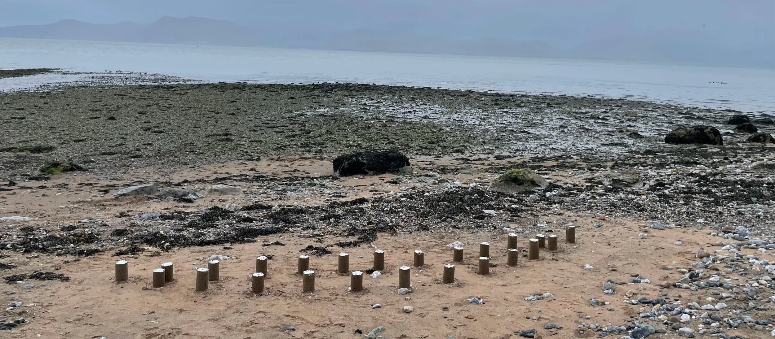 Mae cerfluniau geometrig wedi'u crefftio o dywod, halen a dŵr lleol yn ymddangos ar hyd parthau llanw Traeth Lleiniog, wedi'u hysbrydoli gan ffigurau Antony Gormley, tirweddau dros dro Andy Goldsworthy, a chelf tir Richard Long. Mae'r gweithiau hyn yn parhau ag archwiliad o ecoleg ac olion gweithgaredd dynol o fewn amgylcheddau pontio.