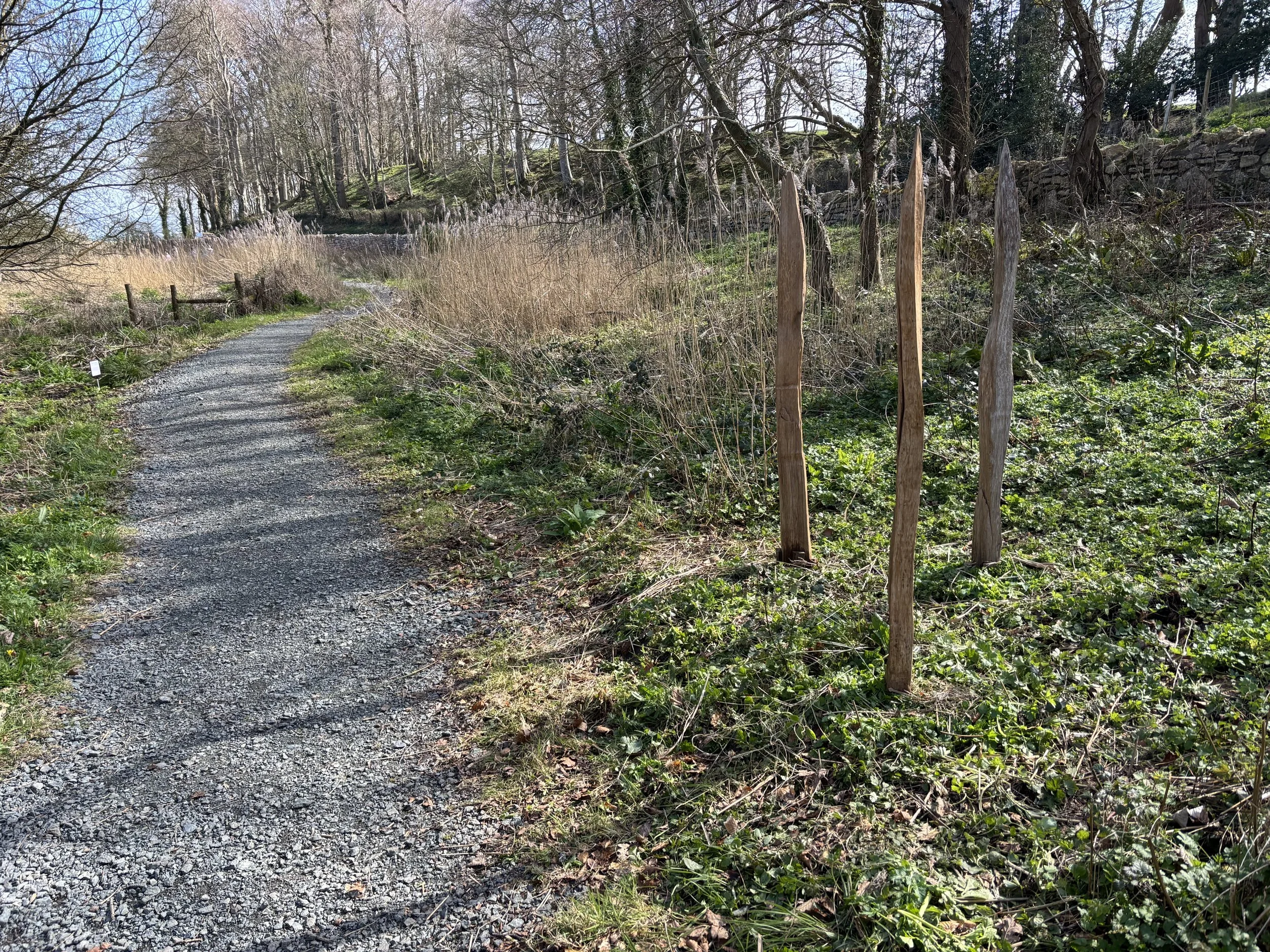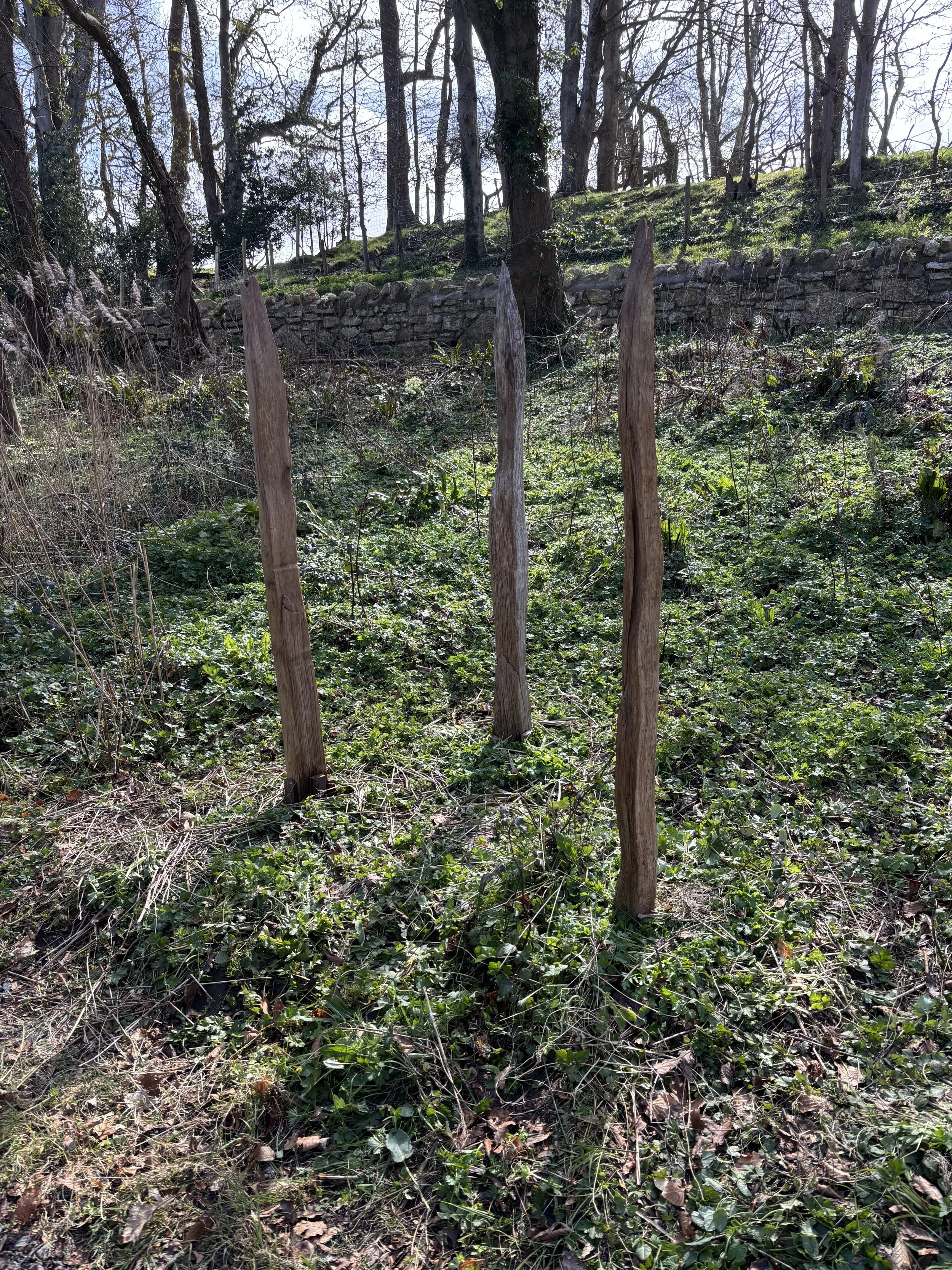 Mae tri phostyn derw yn codi i'r awyr, eu harwynebau wedi'u gweithio'n finimalaidd i ddatgelu harddwch naturiol a ffurf gerfluniol y pren.