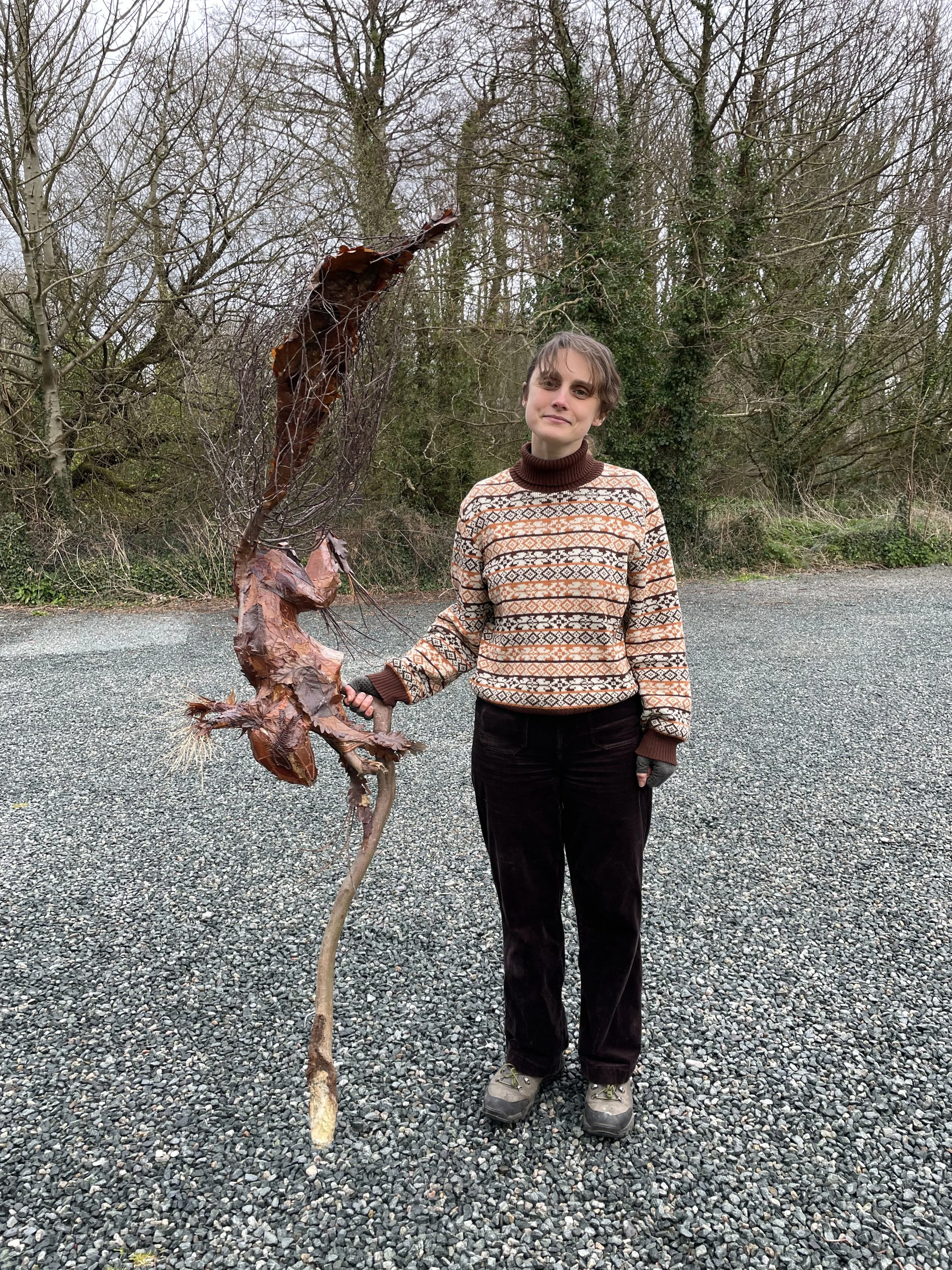 Mae hi'n cwblhau ei cherfluniau cyntaf - gan ddefnyddio amrywiaeth eang o weadau, dulliau a deunyddiau i rannu mynegiant ac unigoliaeth ein rhywogaethau coetir. Mae hi'n cwblhau'r systemau goleuo mewnol ar gyfer y cerfluniau, i oleuo ystod lawn o liwiau eu croen deiliog.