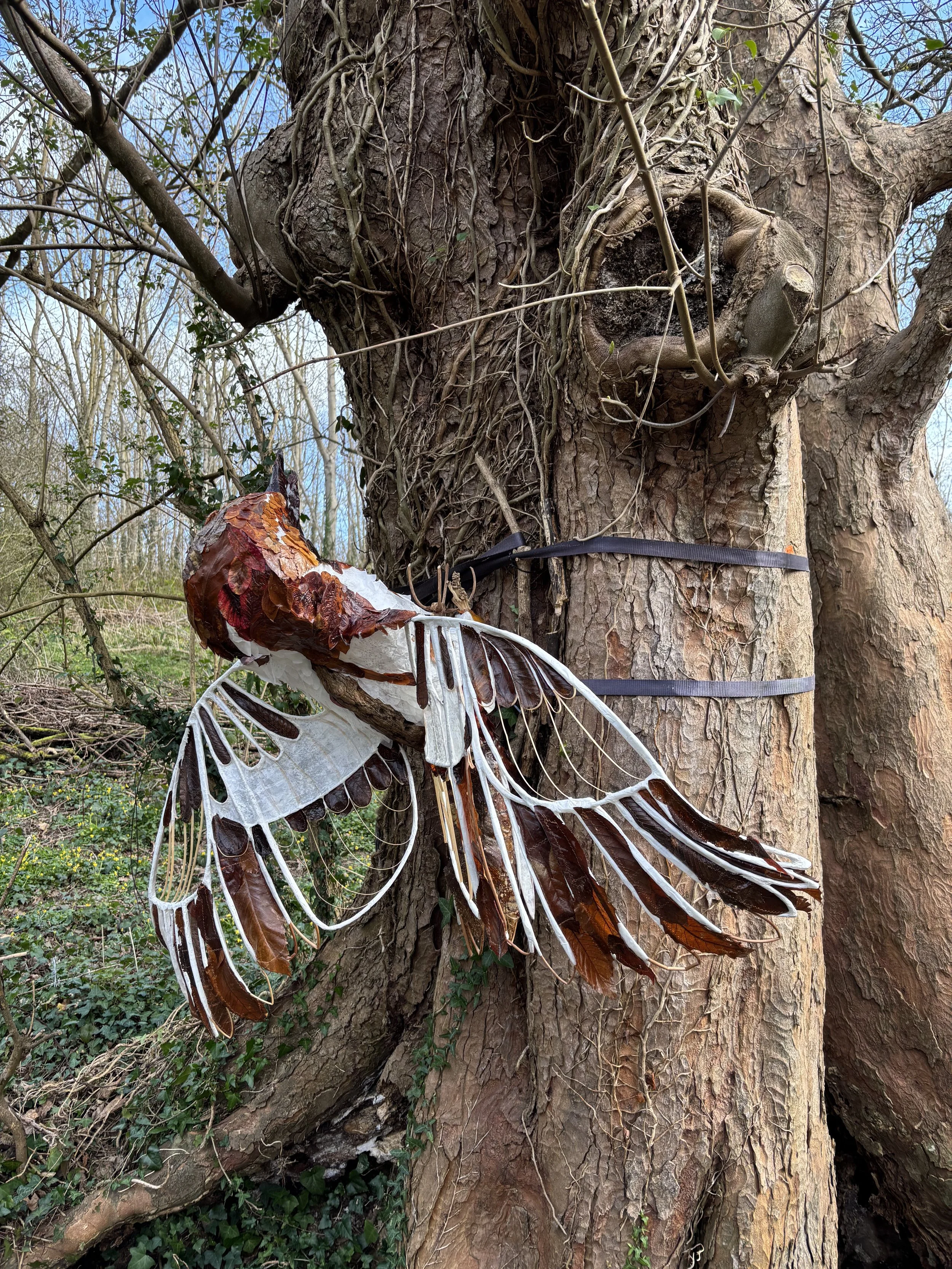 Wedi'i gyflwyno gyntaf yn Llwybr Cerfluniau Aberlleiniog 2026 yn Llangoed. Creodd Angharad gerfluniau goleuedig yn dathlu mamaliaid ac adar Coedwig Lleiniog. Wedi'u crefftio o bren wedi cwympo, dail wedi'u gwnïo, a helyg a chyrs wedi'u plethu, mae pob darn yn tywynnu o'r tu mewn. Mae'r gyfres yn tynnu sylw at rywogaethau lleol - cnocell y coed, gwiwerod coch ac ystlumod - rhai dan fygythiad, gan bwysleisio pwysigrwydd amddiffyn yr ecosystem unigryw hwn. (cliciwch i weld y sgrin lawn)
